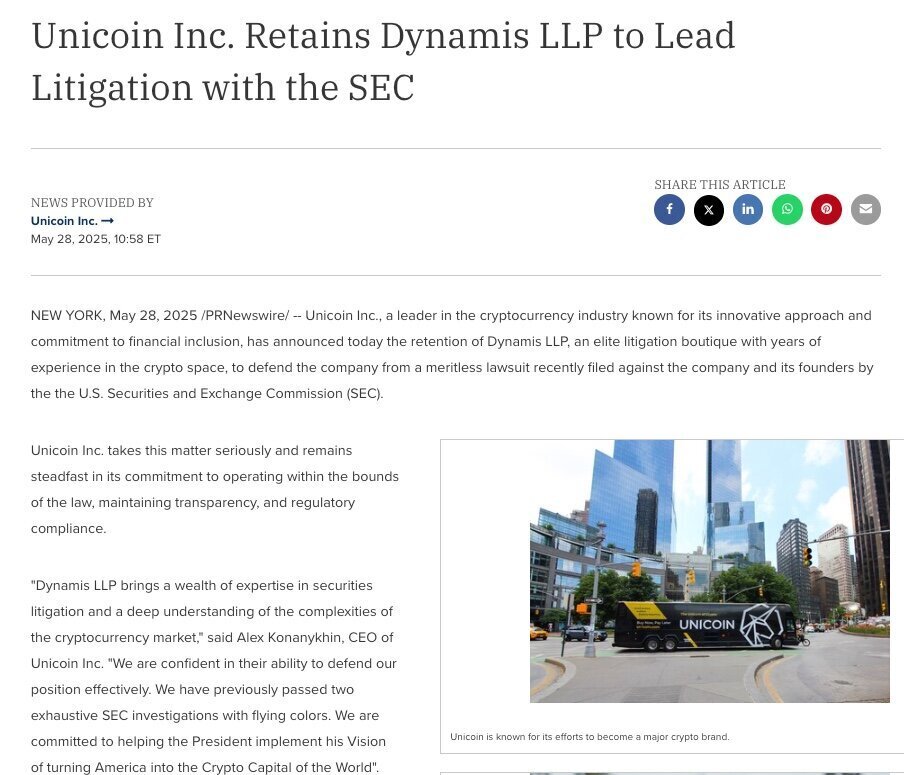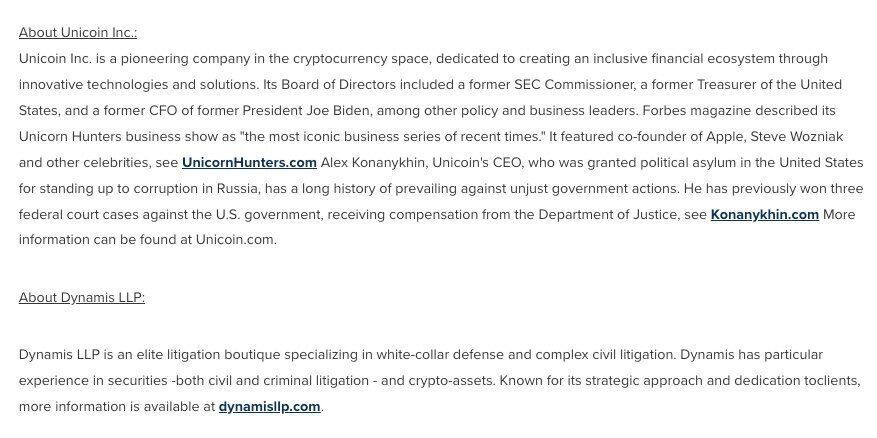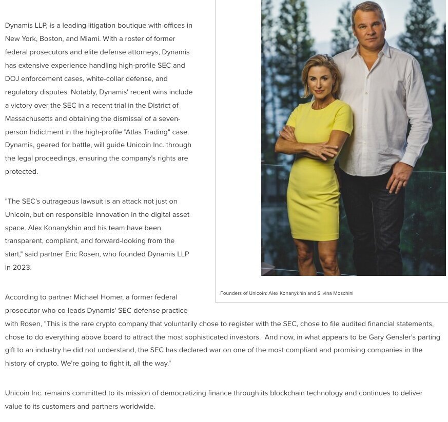 "The SEC's outrageous lawsuit is an attack not just on Unicoin, but on responsible innovation in the digital asset space. Alex Konanykhin and his team have been transparent, compliant, and forward-looking from the start," said partner Eric Rosen, who founded Dynamis LLP in 2023.